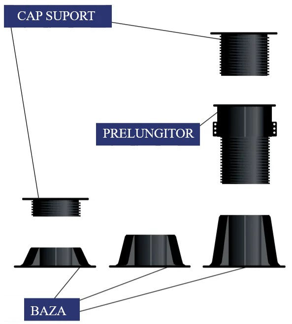 Un sistem reglabil flexibil de pavaj și piedestal de pardoseală conceput pentru înălțimi între 18 mm și 1083 mm.