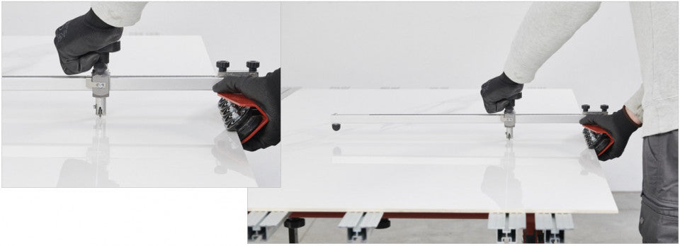 - Pentru executarea inciziei, aparatul poate fi folosit prin așezarea roților pe marginea plăcii (pentru tăieturi paralele) sau, alternativ, la marginea mesei de lucru (pentru tăieturi în diagonală). Pentru a efectua incizia, mențineți T-CUT rulând pe margine și glisați-l lateral de-a lungul întregii lungimi a plăcii în timp ce apăsați simultan în jos pe unitatea butonului de marcare.