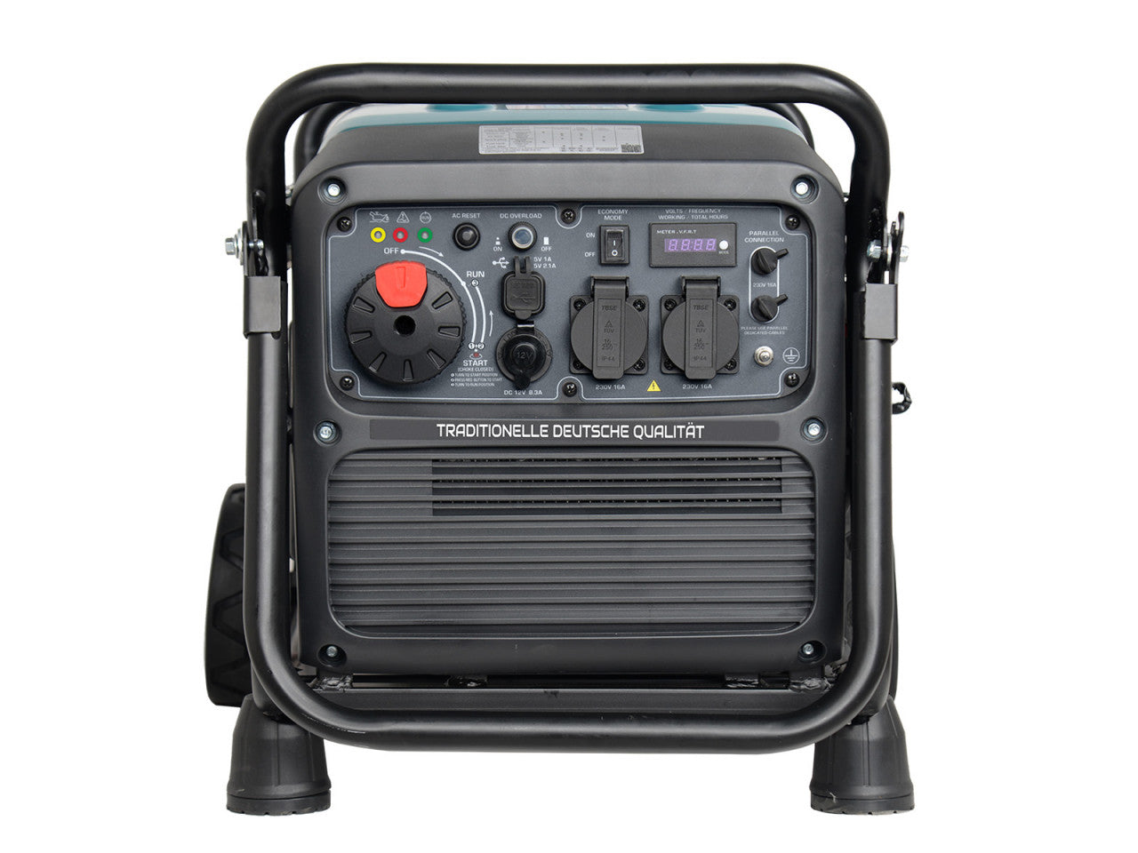 Amplasarea practică a tuturor funcțiilor: indicatoare pentru starea grupului electrogen, care afișează: modul de funcționare, funcționarea întrerupătorului în cazul supraîncărcării sau scurtcircuitului, un nivel de ulei prea scăzut. De asemenea, există și un buton de resetare pentru repornirea sistemului de control și restabilirea alimentării cu electricitate, doua porturi USB 5 V/1 A, 5 V/2,1 A, prize 230V și bornă de împământare.