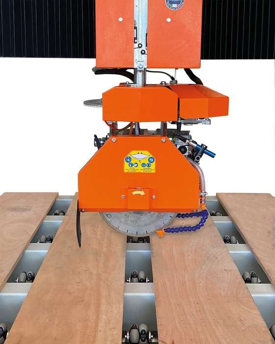 - Masina de taiat marmura si placi, robusta și compacta, capabila sa taie pe axa X (longitudinal) și pe axa Y (transversal). Mișcarea capului de tăiere este gestionată de un panou de control programabil (PLC) integrat al mașinii.
