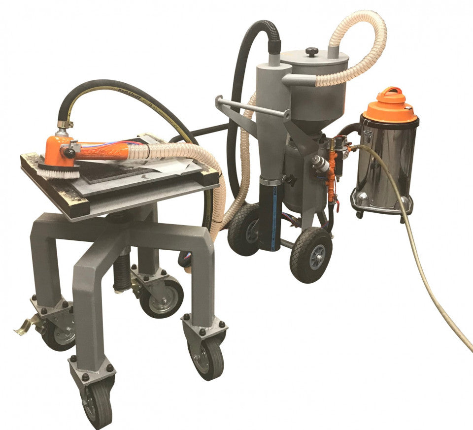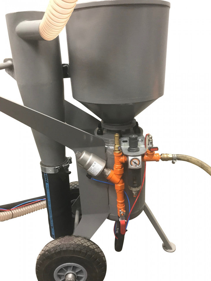 Unitate manuală de sablare fără praf, cu presiune manuală, cu ciclon pentru filtrarea prafului si control pneumatic al procesului de sablare.