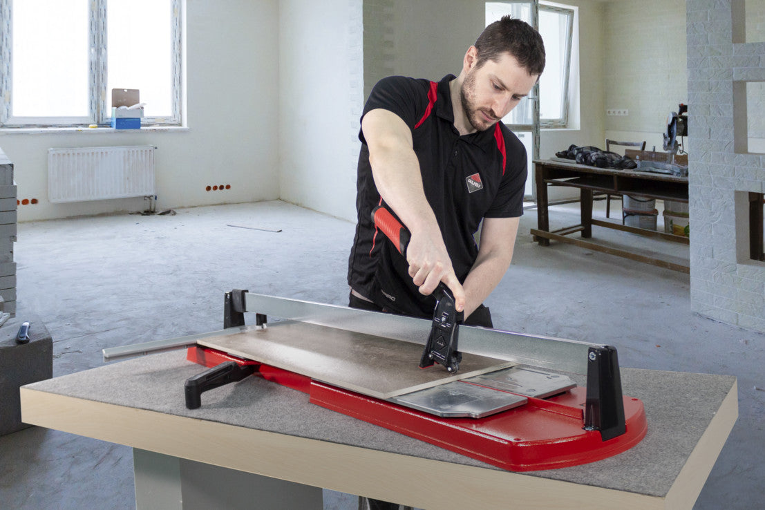 - Frezele manuale RUBI TP-T au o bază de aluminiu cu două straturi de înaltă rezistență, cu efect de absorbție a șocurilor și suporturi laterale pentru plăci mari. Spre deosebire de tăietorul de faianță TP-S, cu acesta lucrăm în altă poziție, în spatele utilajului și trăgând mânerul spre noi.